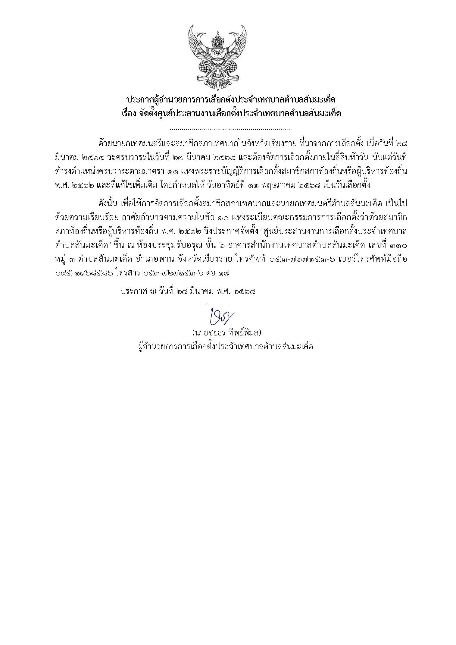 ประกาศผู้อำนวยการการเลือกตั้งประจำเทศบาลตำบลสันมะเค็ด เรื่อง จัดตั้งศูนย์ประสานงานเลือกตั้งประจำเทศบาลตำบลสันมะเค็ด