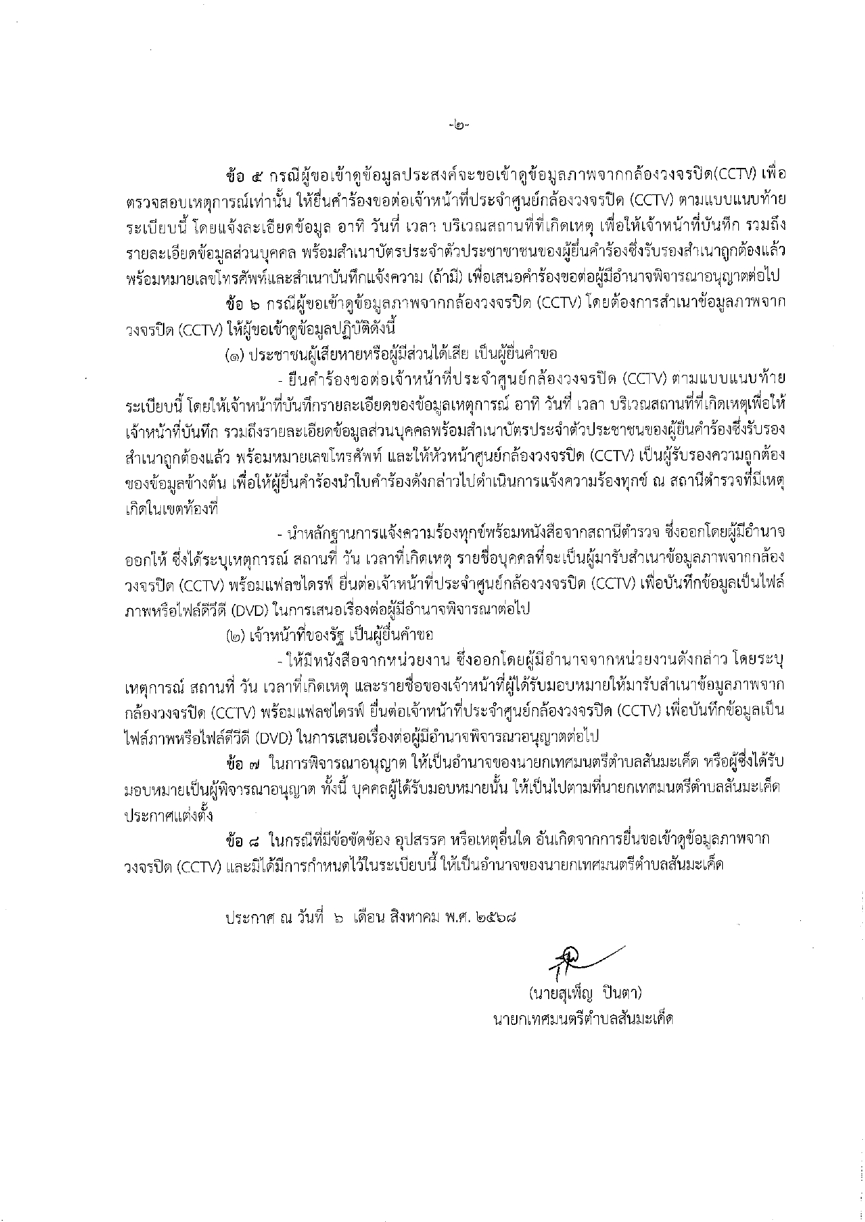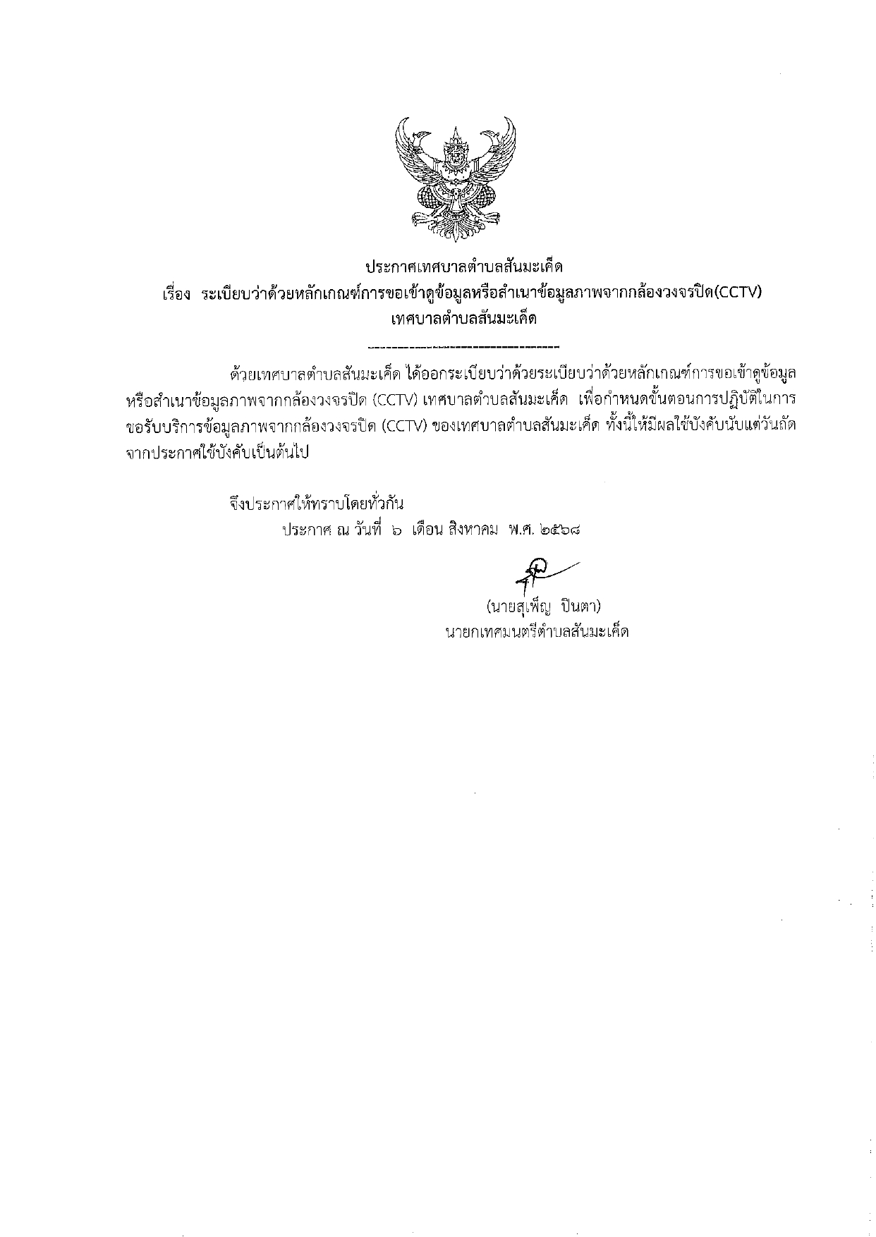 ประกาศเทศบาลตำบลสันมะเค็ด เรื่อง ระเบียบว่าด้วยหลักเกณฑ์การขอเข้าดูข้อมูลหรือสำเนาข้อมูลภาพจากกล้องวงจรปิด(CCTV) เทศบาลตำบลสันมะเค็ด