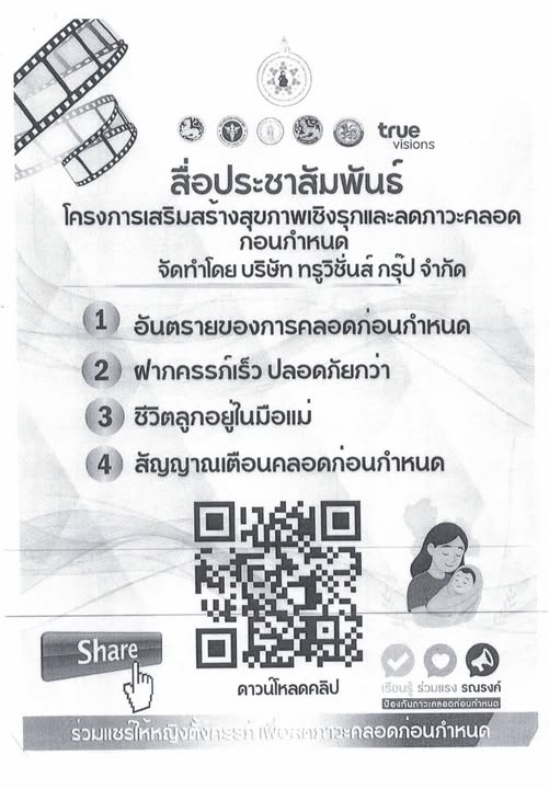 รายละเอียด : ขอเชิญชวนผู้ที่สนใจ และ คุณแม่ตั้งครรภ์ ทุกท่านรับชมสื่อประชาสัมพันธ์สุดสำคัญใน "โครงการเสริมสร้างสุขภาพเชิงรุกและลดภาวะคลอดก่อนกำหนด" จัดทำโดย บริษัท ทรูวิชั่นส์ กรุ๊ป จำกัด ร่วมกับหน่วยงานด้านสาธารณสุข